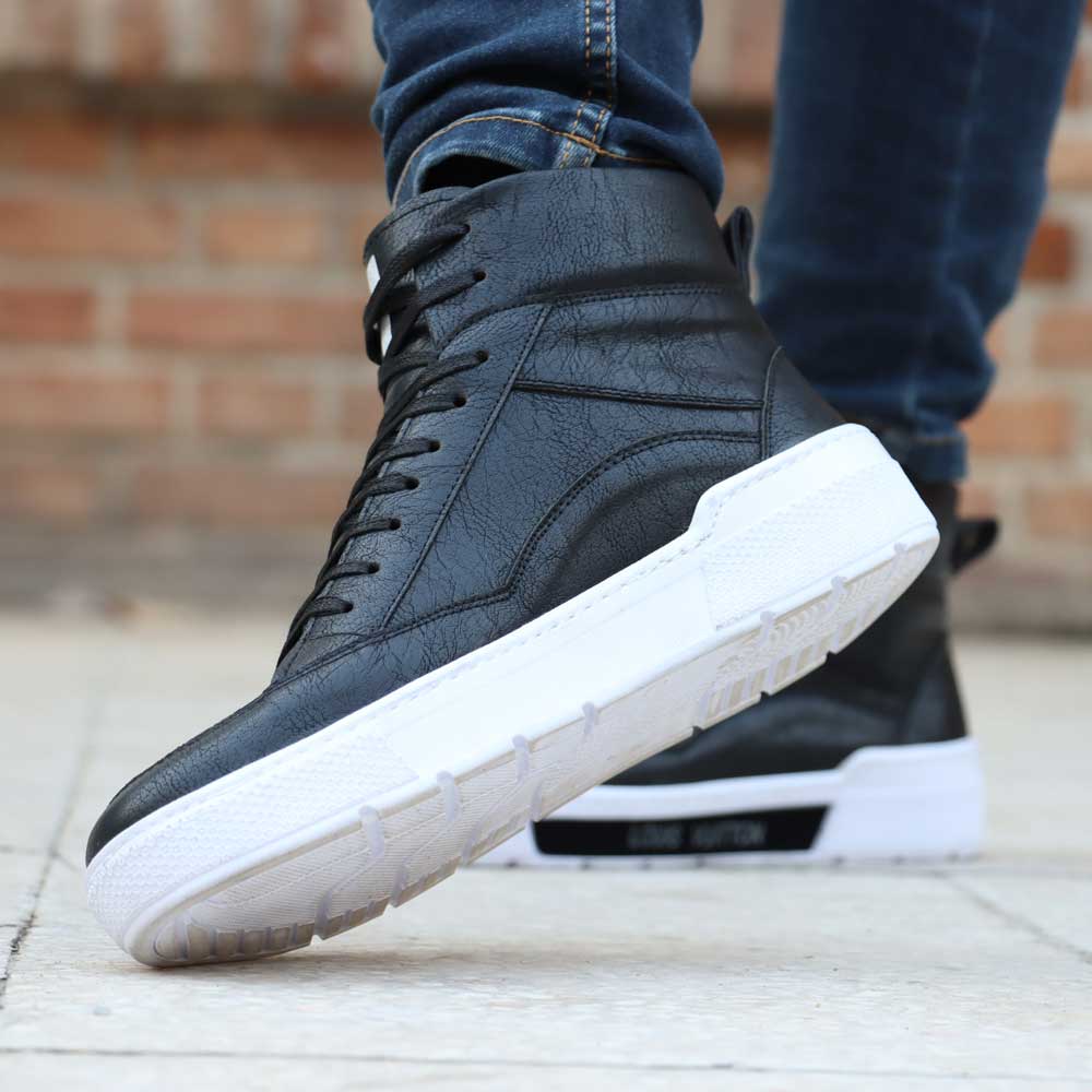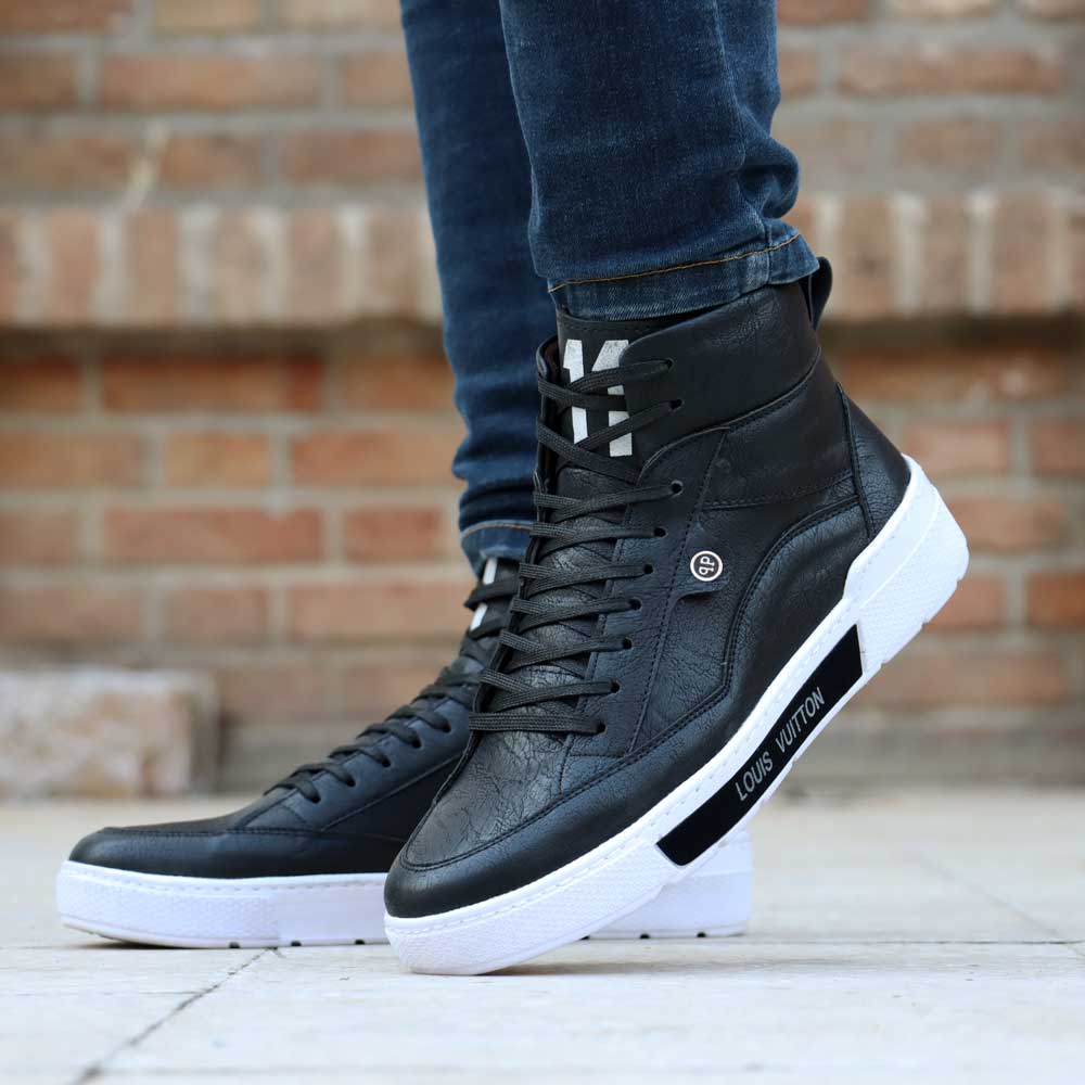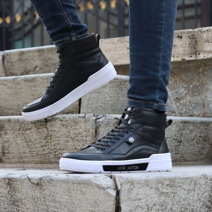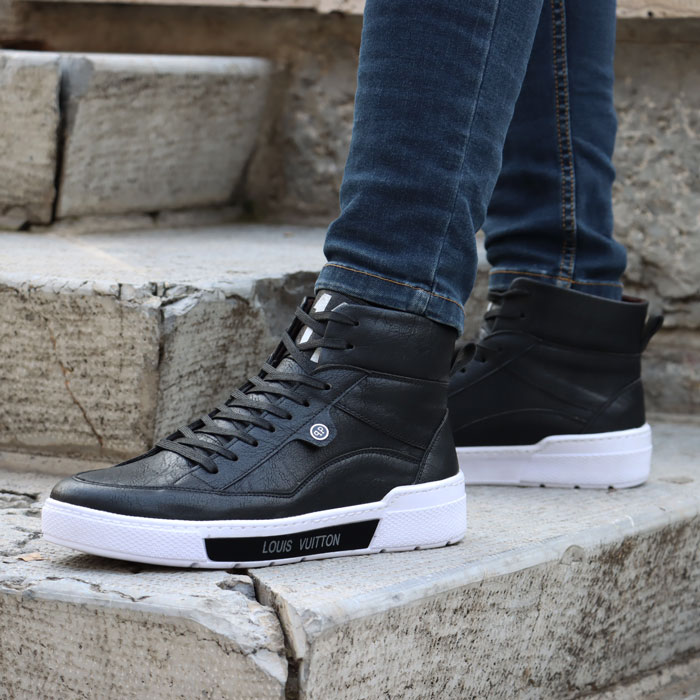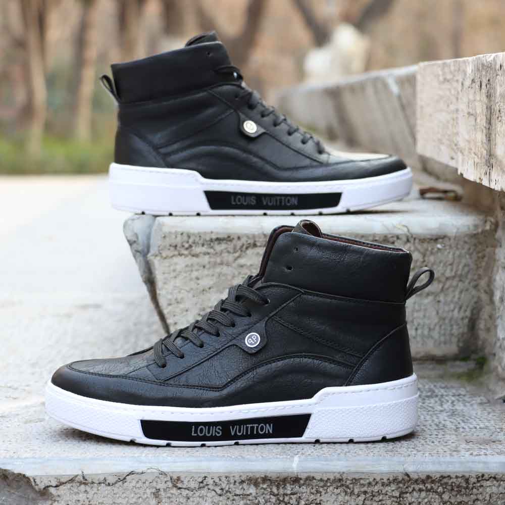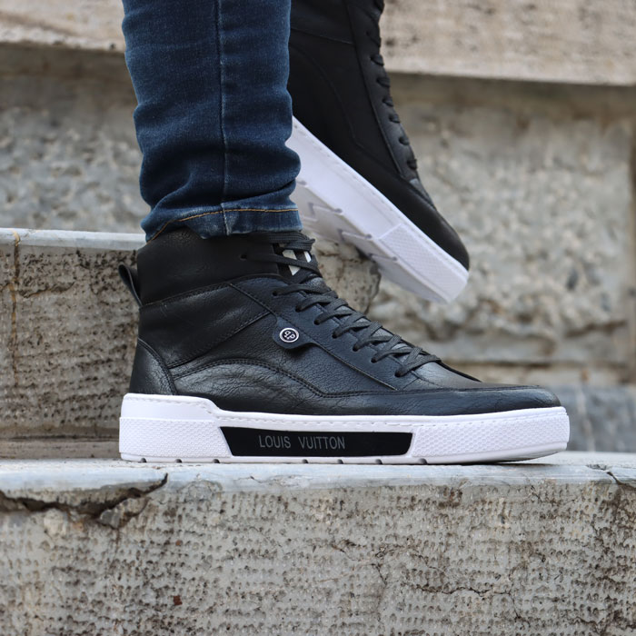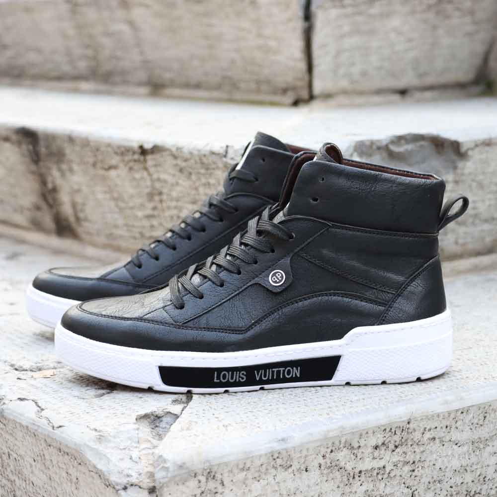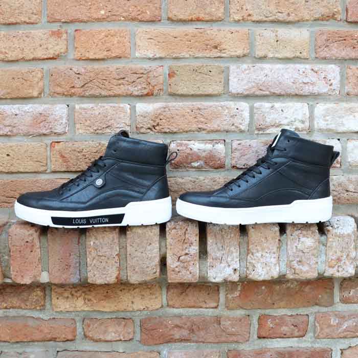 قسمت رویه نیم بوت مشکی لوییز ویتون از طراحی ساده و یکدست میباشد و در قسمت پنجه نیم بوت یک تکه qp زده شده است .